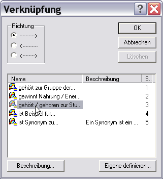 Sobald Sie die Linie gezogen haben, öffnet sich ein Auswahlfenster, in dem Sie die gewünschte Verknüpfung und die Richtung der Verknüpfung auswählen können.